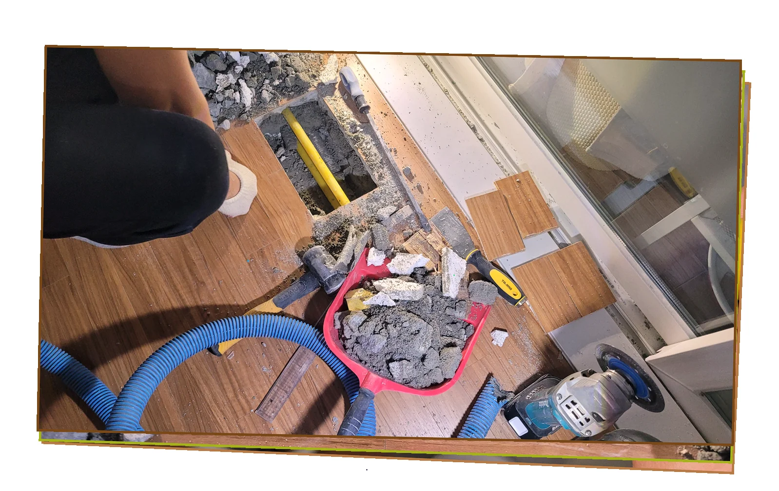 구석구석 조사한 결과 매립 배관의 침하로 인한 손상 에서 물이 새고 있었습니다.